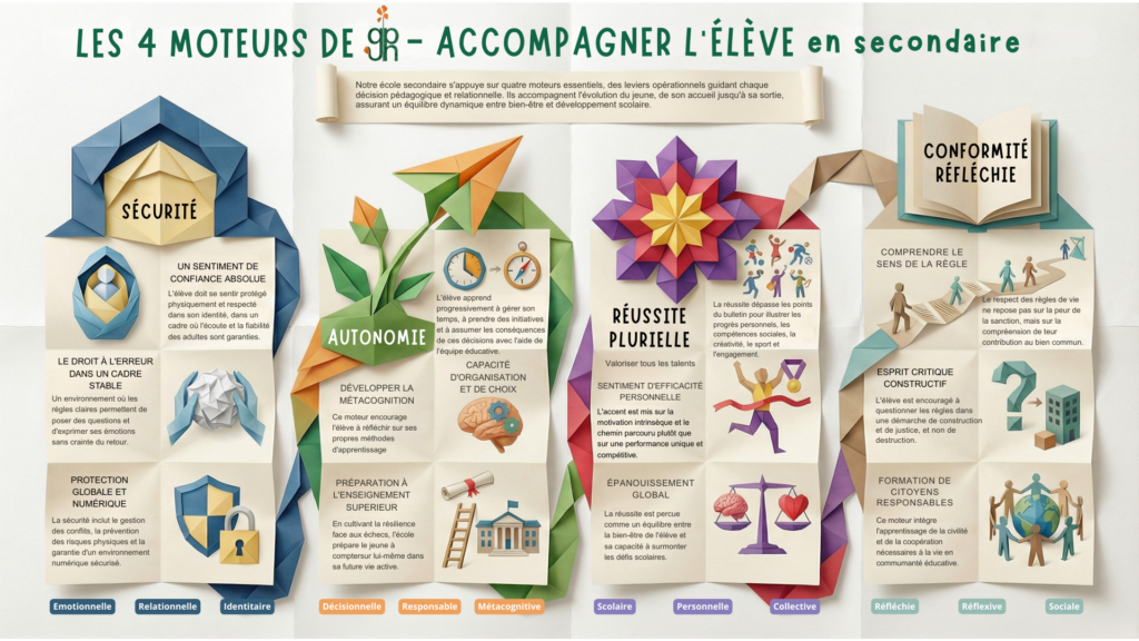 Une fois entrés dans notre enceinte scolaire (entièrement clôturée), les élèves ne peuvent la quitter qu’à la fin des cours. Cette mesure garantit la sécurité de tous.