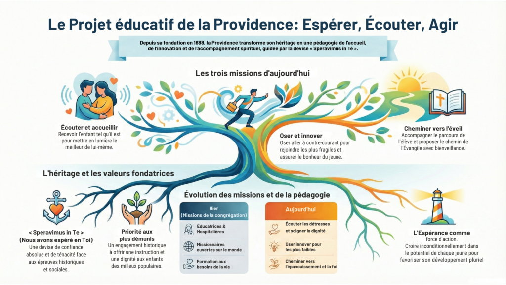 Notre école se réfère à une tradition chrétienne qui s’inscrit dans la continuité de l’esprit de la Congrégation des Soeurs de la Providence. En ce sens, l’école accueille chacun pour ce qu’il est en lui proposant un chemin de développement de sa personne dans toutes les dimensions, incluant la dimension spirituelle.